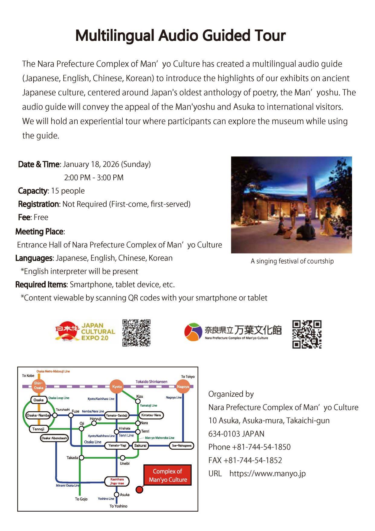 万葉文化館ではこのたび、訪日外国人の方に奈良・明日香の魅力を発信するため、日本最古の歌集『万葉集』を中心とした古代日本文化に関する当館展示の見所を紹介する「...