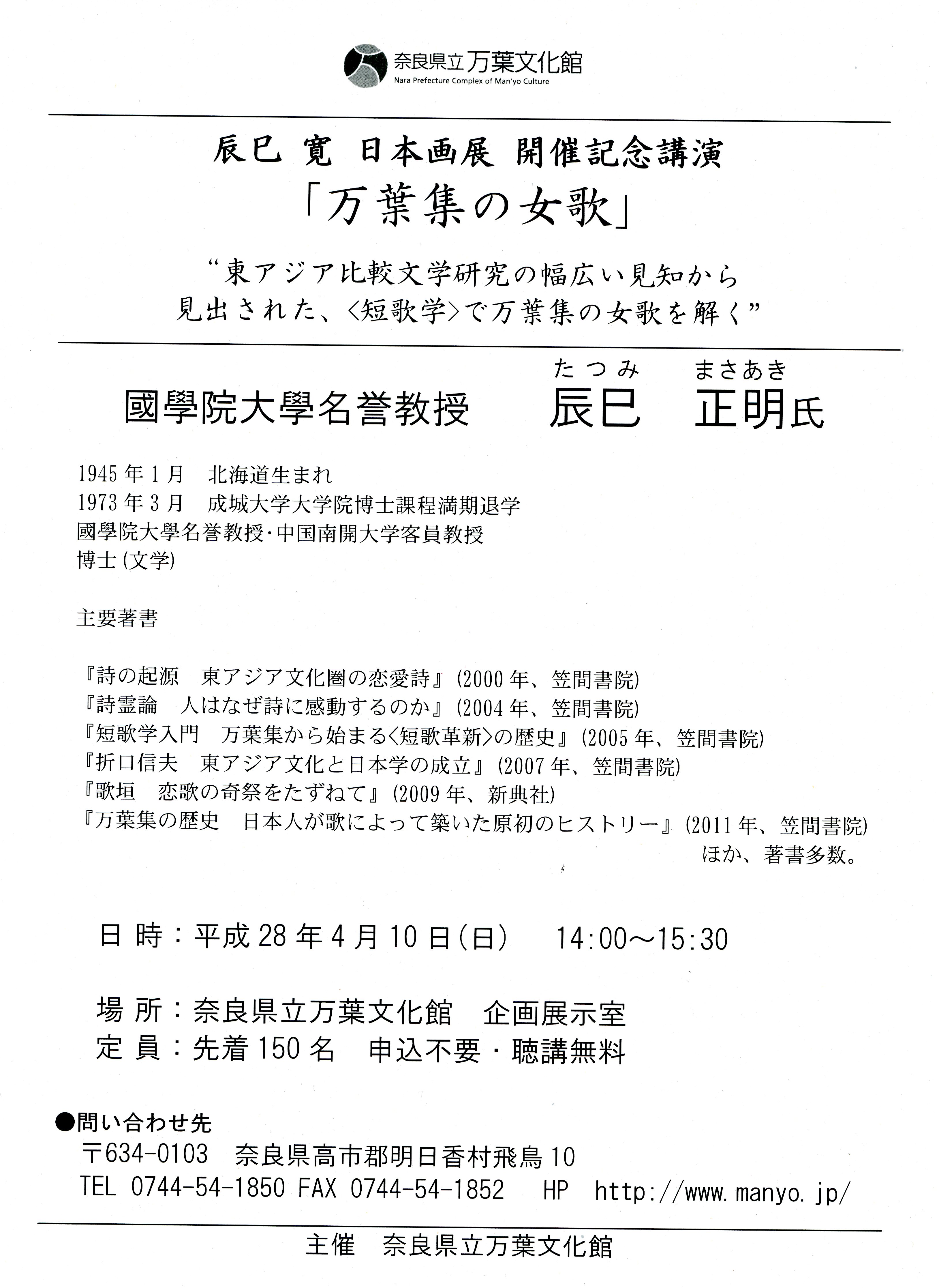 “東アジア比較文学研究の幅広い見地から見出された、<短歌学>で万葉集の女歌を解く” 講 師: 辰巳 正明 氏(國學院大學名誉教授) 演 題:「万葉集の女歌」 日 時: 平成28年4月10日(日) 14:00~15:30(開場13:30) 事前申し込み不要/聴講無料 **辰巳寛 日本画展 開催記念講演**