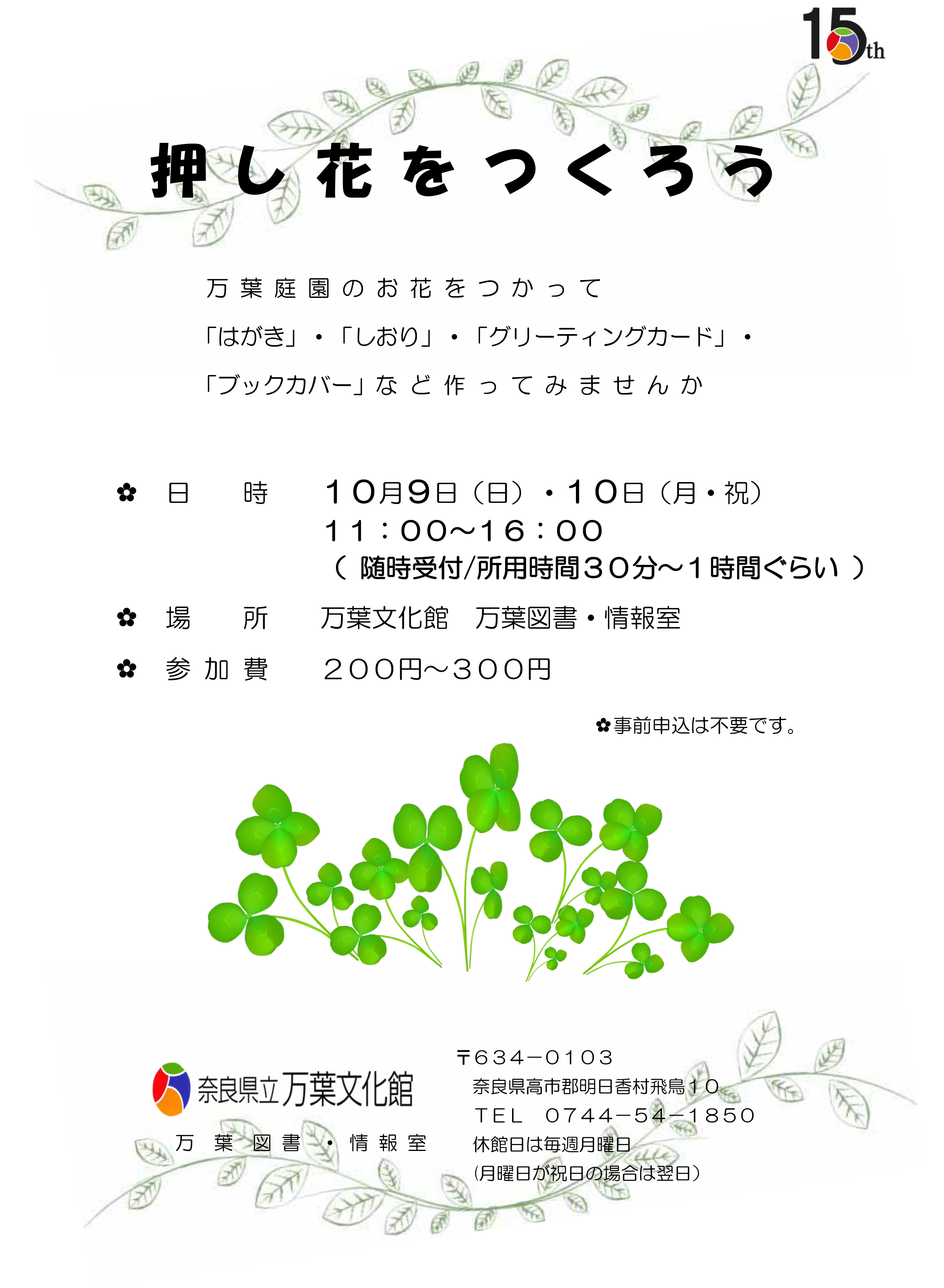 万 葉 庭 園 の お 花 を つ か っ て 「はがき」・「しおり」・「グリーティングカード」・ 「ブックカバー」な ど 作 っ て み ま せ ん か ✿日 時 10月9日(日)・10日(月・祝) 11:00~16:00 ( 随時受付/所用時間30分~1時間ぐらい ) ✿場 所 万葉文化館 万葉図書・情報室 ✿参 加 費 200円~300円 ✿事前申込は不要です。