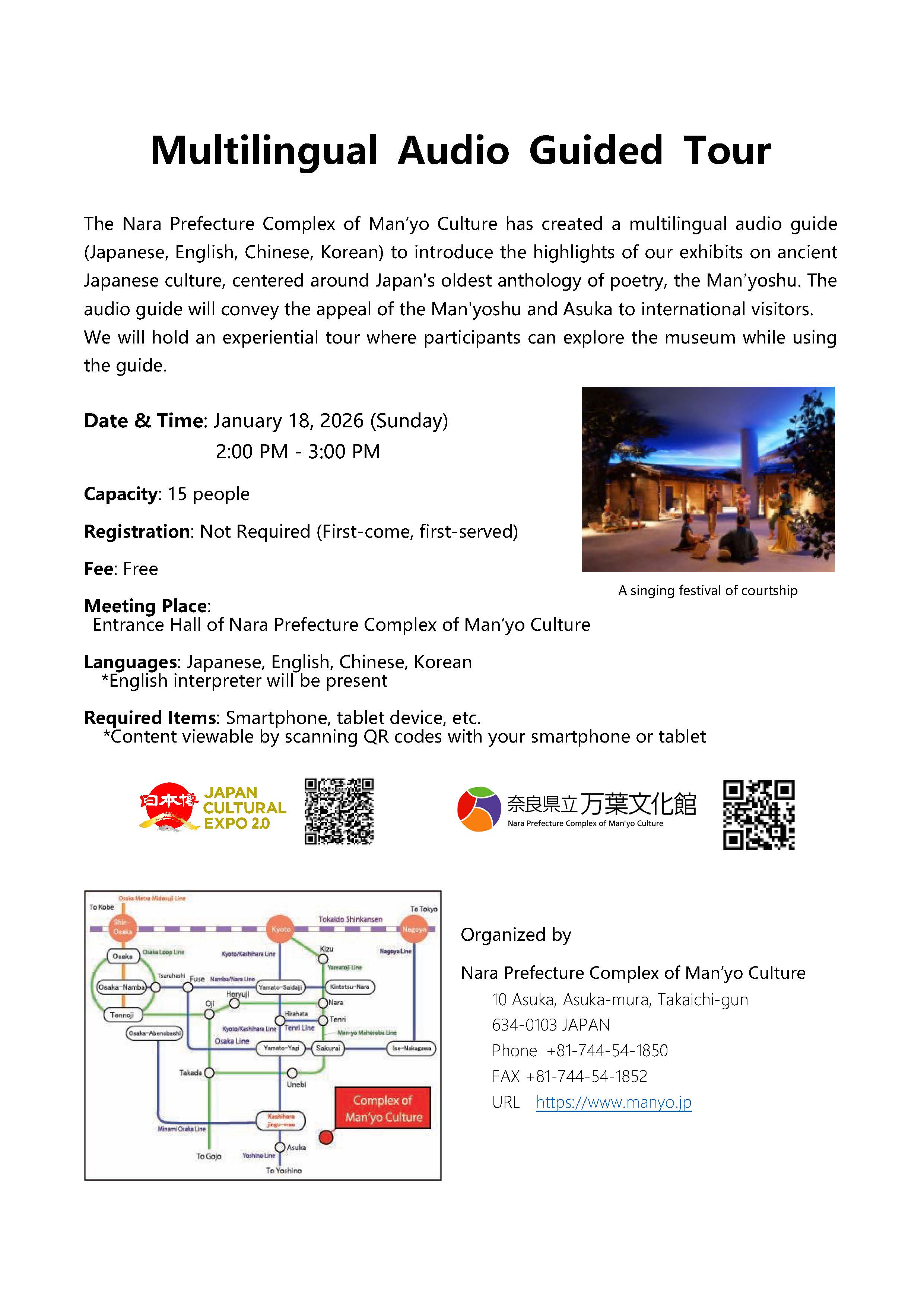 万葉文化館ではこのたび、訪日外国人の方に奈良・明日香の魅力を発信するため、日本最古の歌集『万葉集』を中心とした古代日本文化に関する当館展示の見所を紹介する「多言語音声ガイド」(日本語・英語・中国語・韓国語)を制作いたしました。